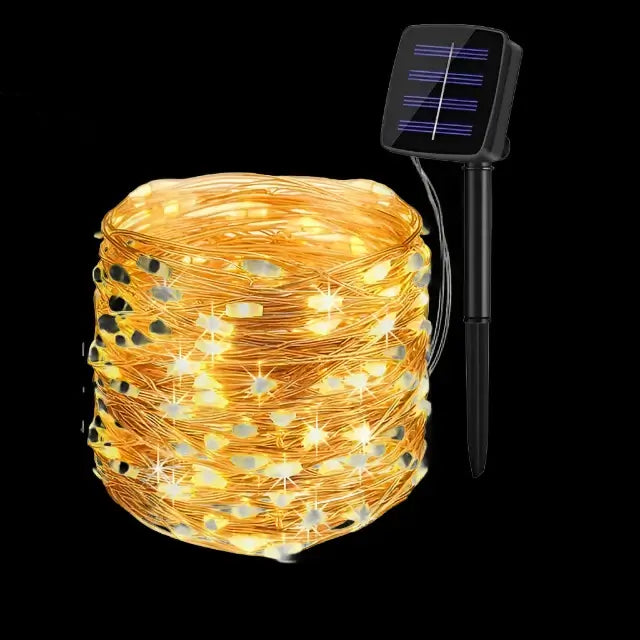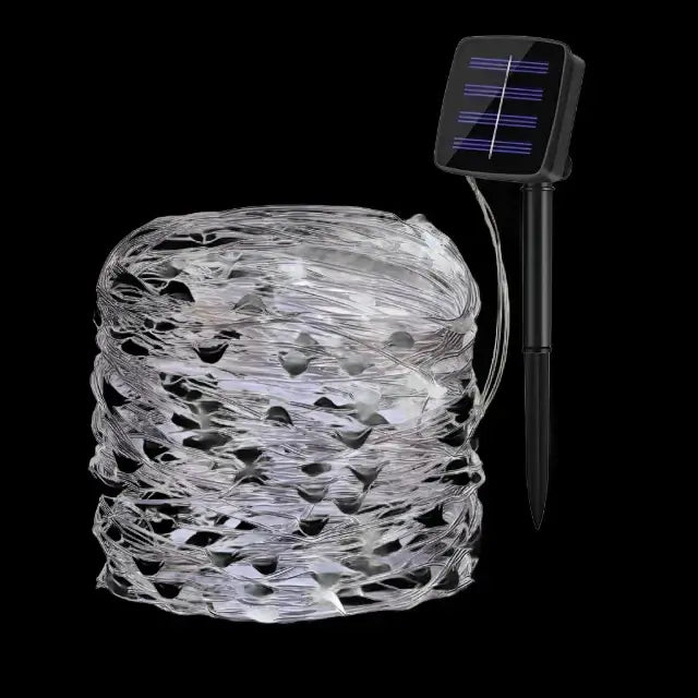 This lighting set is made to last outside. You get a 12-meter string that holds 100 bright LED bulbs. The entire system comes with its own solar panel and a ground stake for quick and easy placement in the ground. The product's flexible copper wire allows for a wide range of uses, from wrapping objects to setting up custom shapes.